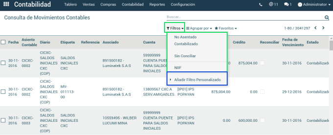 Así mismo, filtrar los documentos por su Estado: Contabilizado, No asentado, Sin Conciliar, Niif o añadir filtro personalizado.