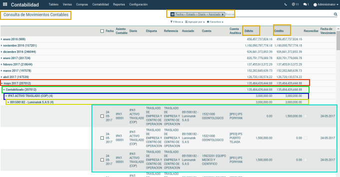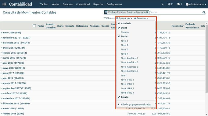 Pueden realizarse varias agrupaciones o filtros a la vez, por ejemplo, agrupar primero por fecha, seguido por estado, por diario, por asociado, todo conforme a la necesidad que se tenga.