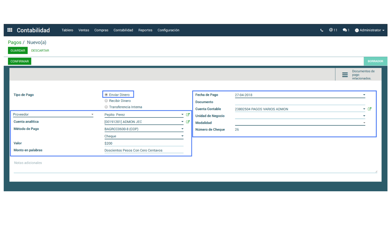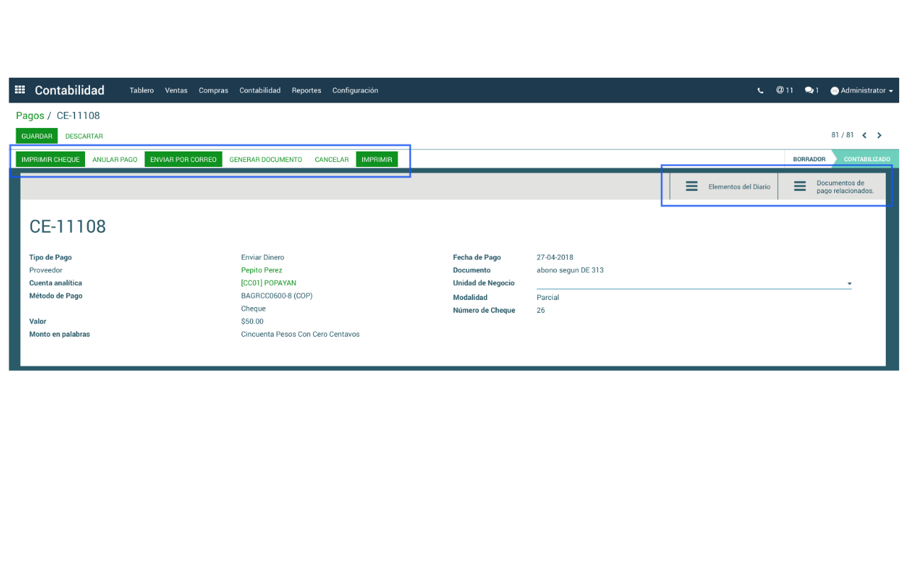 Una vez confirmado el pago este pasa a estado Contabilizado y el sistema activa los siguientes opciones: