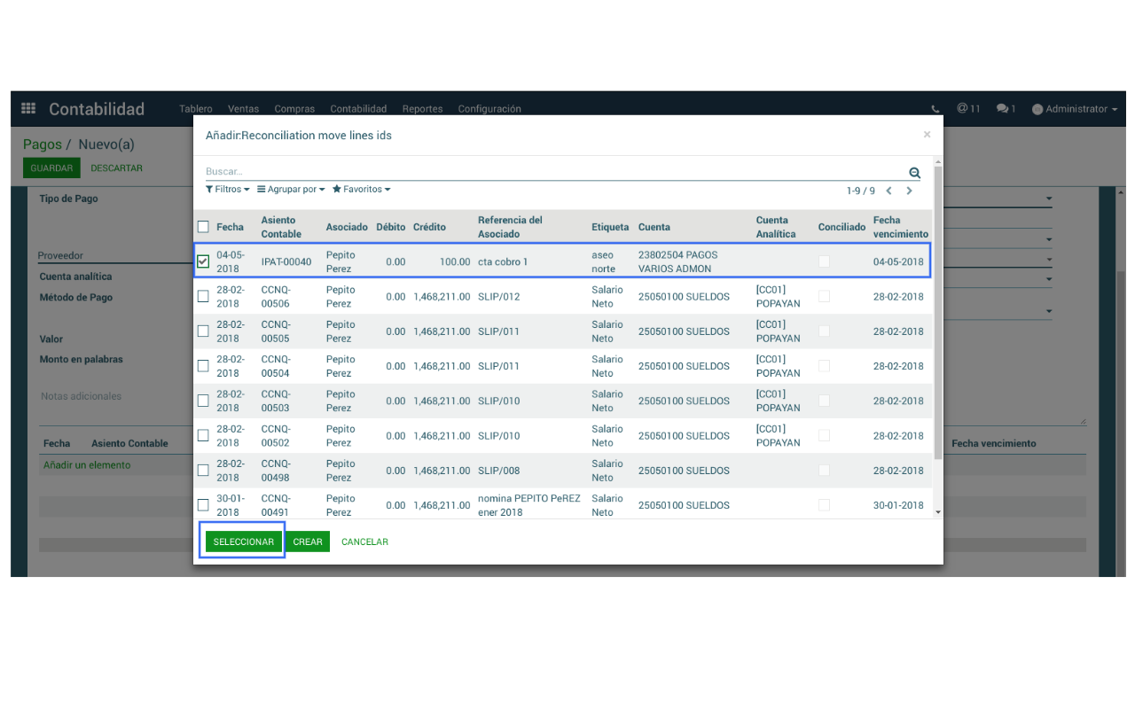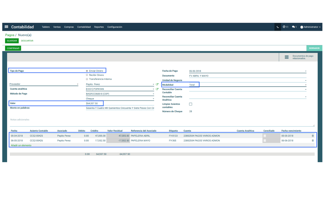 Módulo Contabilidad > Compras o Ventas > Pagos > Crear