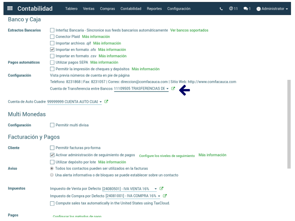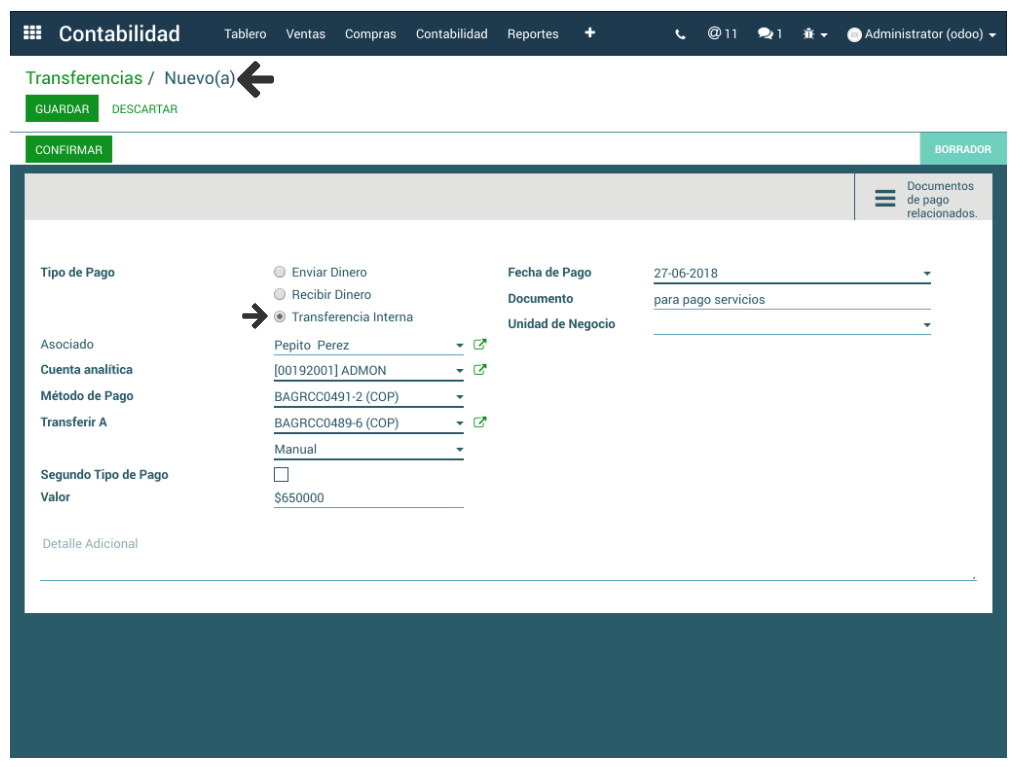 Este tipo de pago se utiliza para transferir recursos entre cuentas bancarias o de efectivo de la misma compañía. Antes de iniciar el proceso de Transferencia debe asegurarse que la cuenta contable configurada para transferencias internas en el Menú Configuración > Ajustes se encuentre seleccionada.
