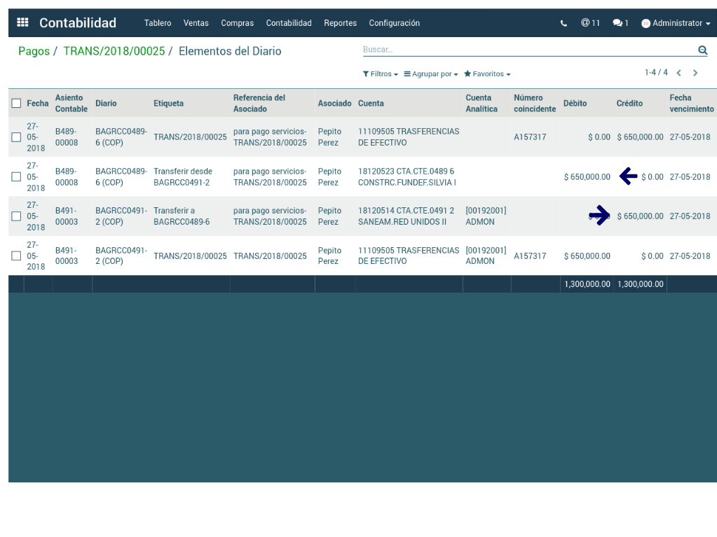 Si se da clic sobre Elementos del Diario puede visualizarse cada una de las líneas generadas en la transferencia llevada a cabo, incluyendo las líneas de la cuenta puente.