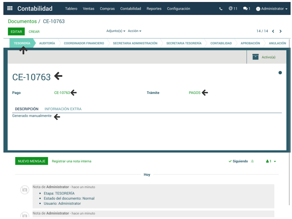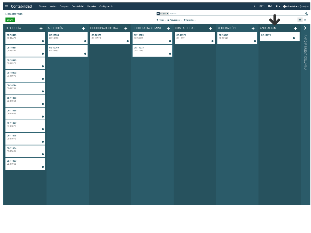 Los documentos creados pueden visualizarse en Configuración > Trámite de Pagos > Documentos > Agrupar por Etapa. En esta pantalla las etapas son visualizadas como columnas y el documento creado se encuentra en la primera etapa del trámite que para esta compañía corresponde a Tesorería.