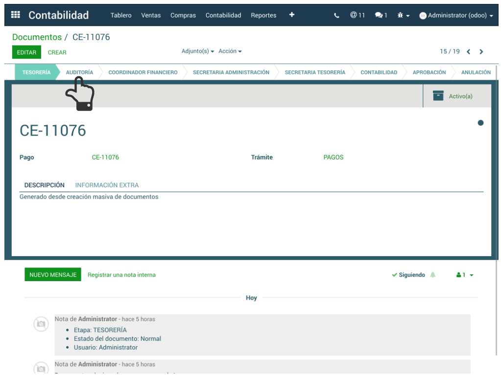 Se da clic sobre el documento a tramitar y clic en Editar. Estando en la pantalla principal del documento se pueden visualizar todos las etapas que contiene el trámite hasta su aprobación o anulación. Para dar paso a la siguiente etapa basta con dar clic en la etapa respectiva. El cambio de etapa solo puede darse si el usuario cuenta con el permiso adecuado, en Grupos Permitidos en la configuración de las etapas.