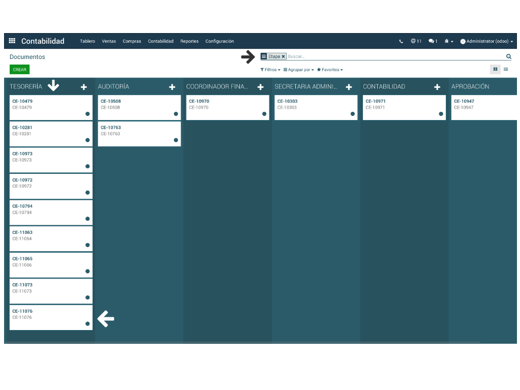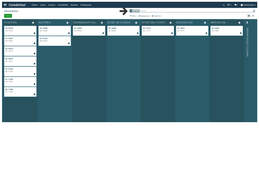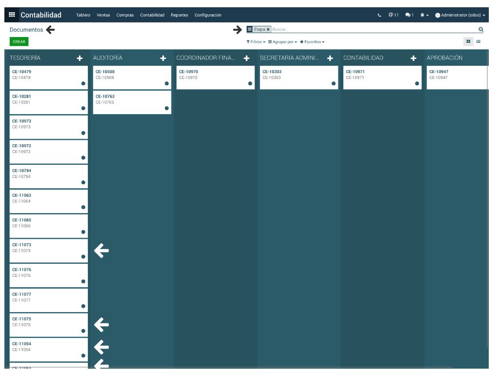 La visualización de los documentos creados se puede observar en la ruta Configuración > Documentos > Agrupar por Etapa