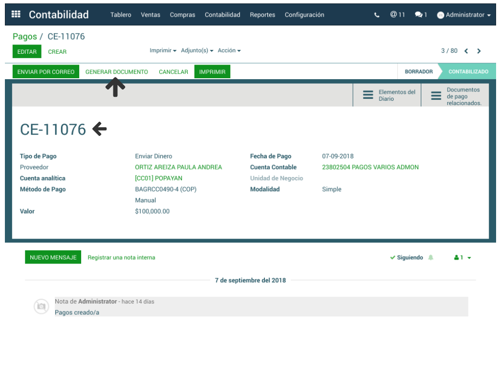 Desde la pantalla principal del pago se da clic en Generar Documento.