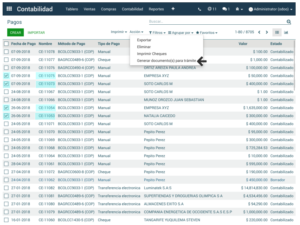 Desde el menú Contabilidad > Compras > Pagos se seleccionan los pagos requeridos para dar inicio al trámite y dando clic sobre la opción Acción se selecciona Generar documentos para trámite.