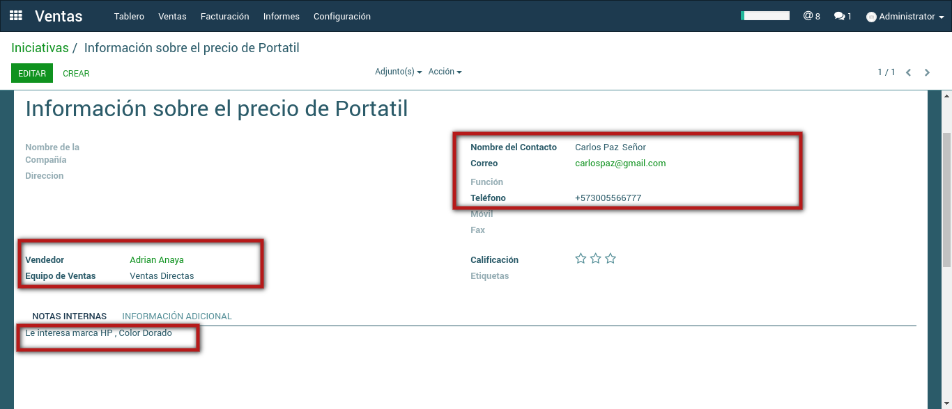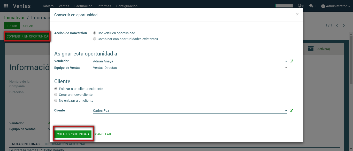 Cuando se obtiene una respuesta positiva de parte del contacto sobre el deseo de comprar convertimos finalmente esta iniciativa en una oportunidad de negocio.