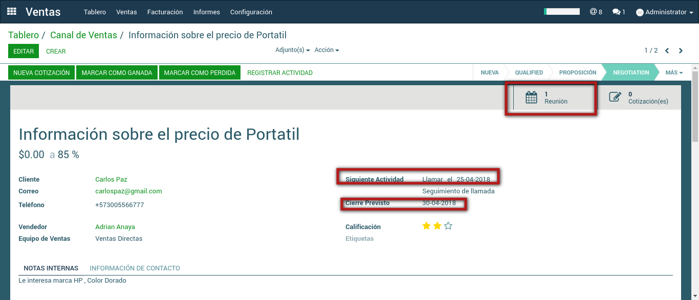 Si después de esta labor comercial el contacto decide adquirir el producto, se puede marcar la oportunidad como ganada.