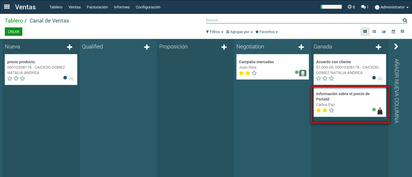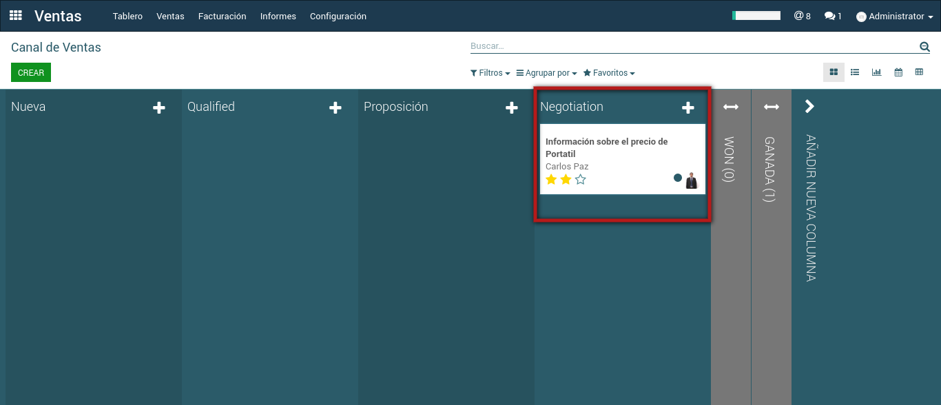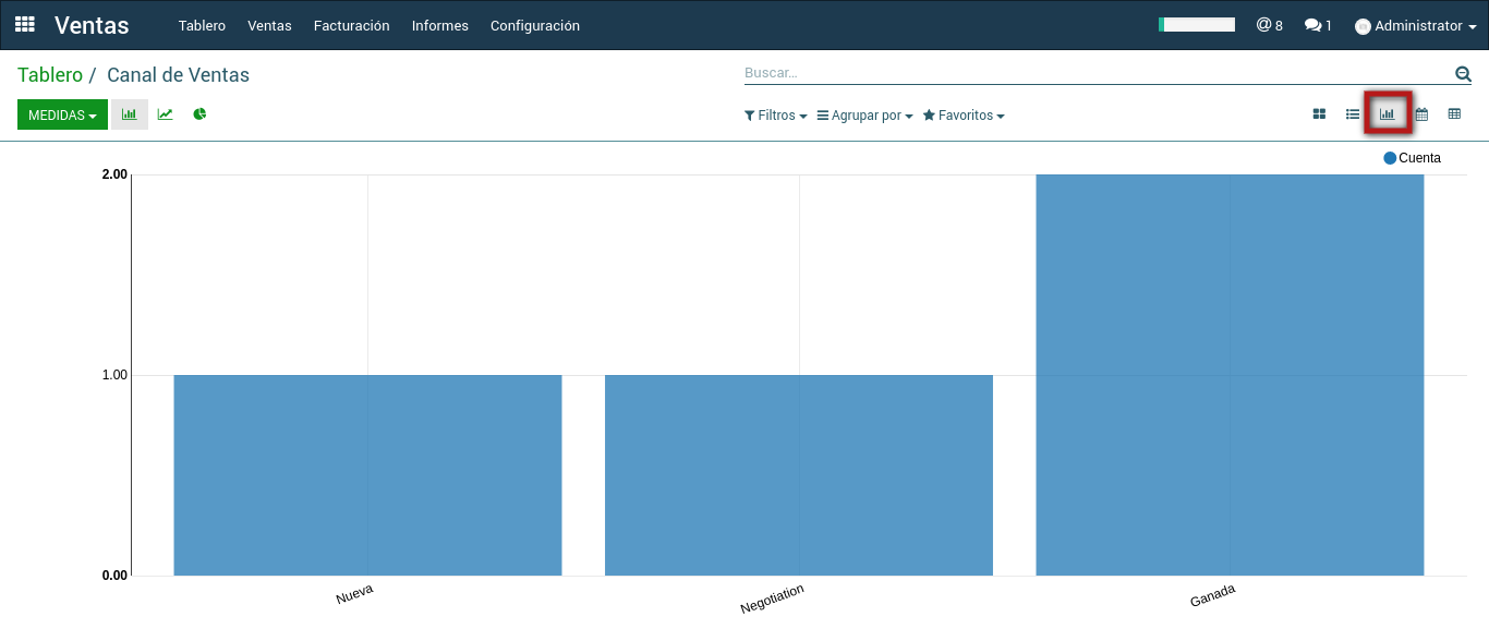 Para ver las oportunidades y etapas, ir a menú Ventas > Canal de ventas