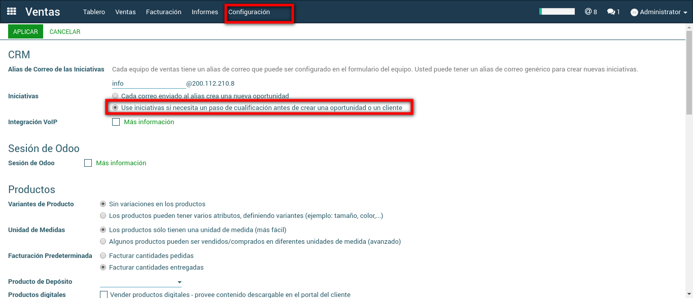 > Módulo de ventas > Configuración > Configuración > Opción use iniciativas