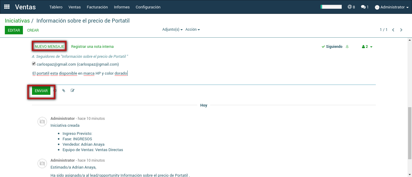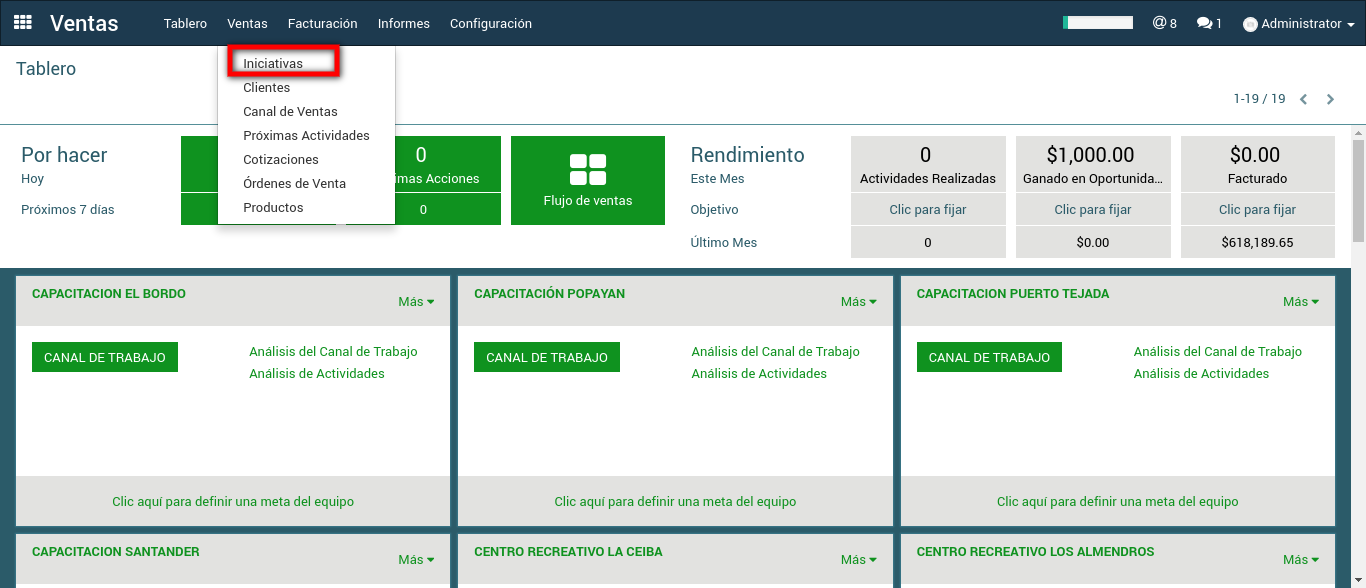 Una vez obtenida la configuración, ir al menú de ventas, opción iniciativas.