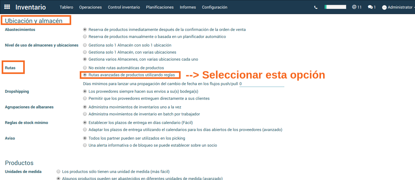 Configuración > Ajustes > Ubicación y Almacen > rutas