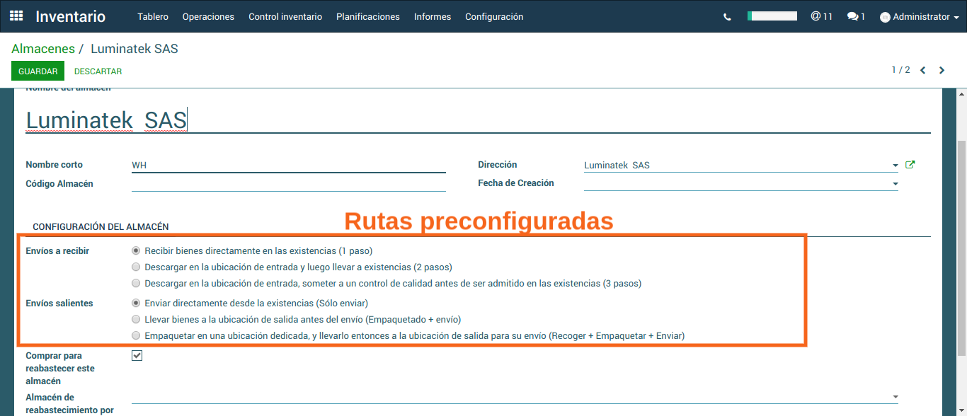 2.1. Rutas preconfiguradas: Odoo tiene algunas rutas preconfiguradas para los almacenes las opciones envios a rebir y envios salientes configuran algunas rutas de acuerdo a las elecciones.