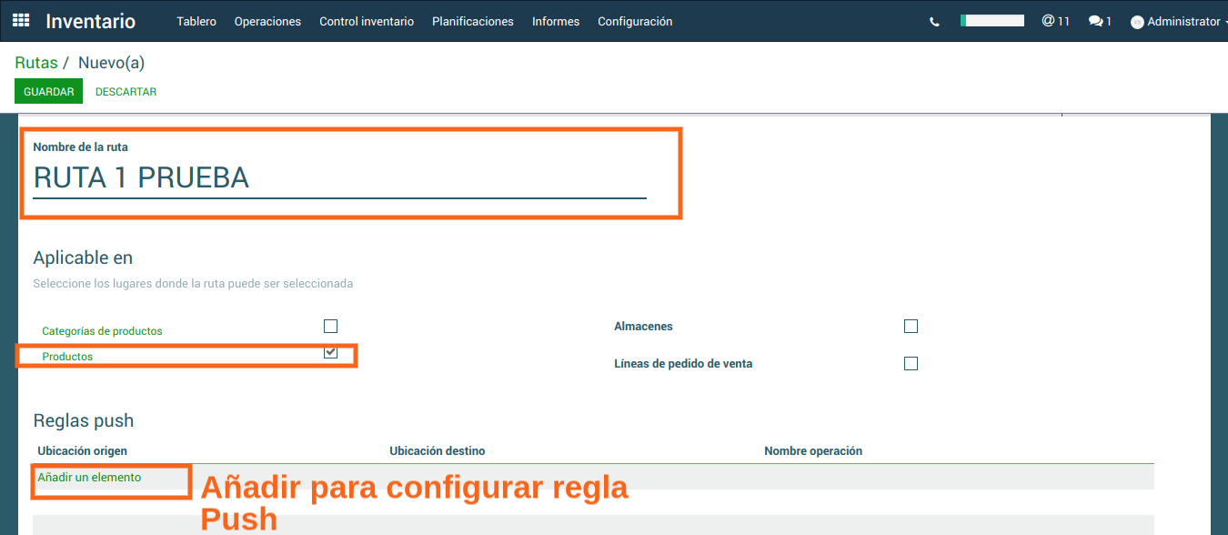 - Reglas Push: Las reglas Push presionan cuando los productos ingresan a ubicación específica. Estas automáticamente trasladan el producto a la nueva ubicación. Si una regla Push puede ser utilizada o no depende de las reglas aplicables.