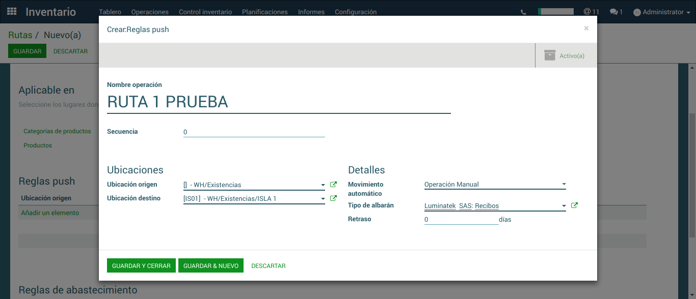 - Nombre del almacén: Nombre que se desea dar a la ruta