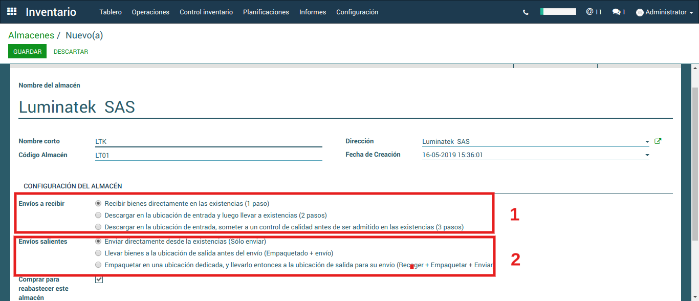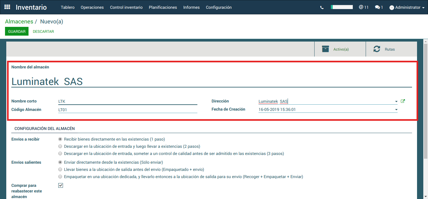 Ruta: Inventario > Configuración > Almacenes > Crear