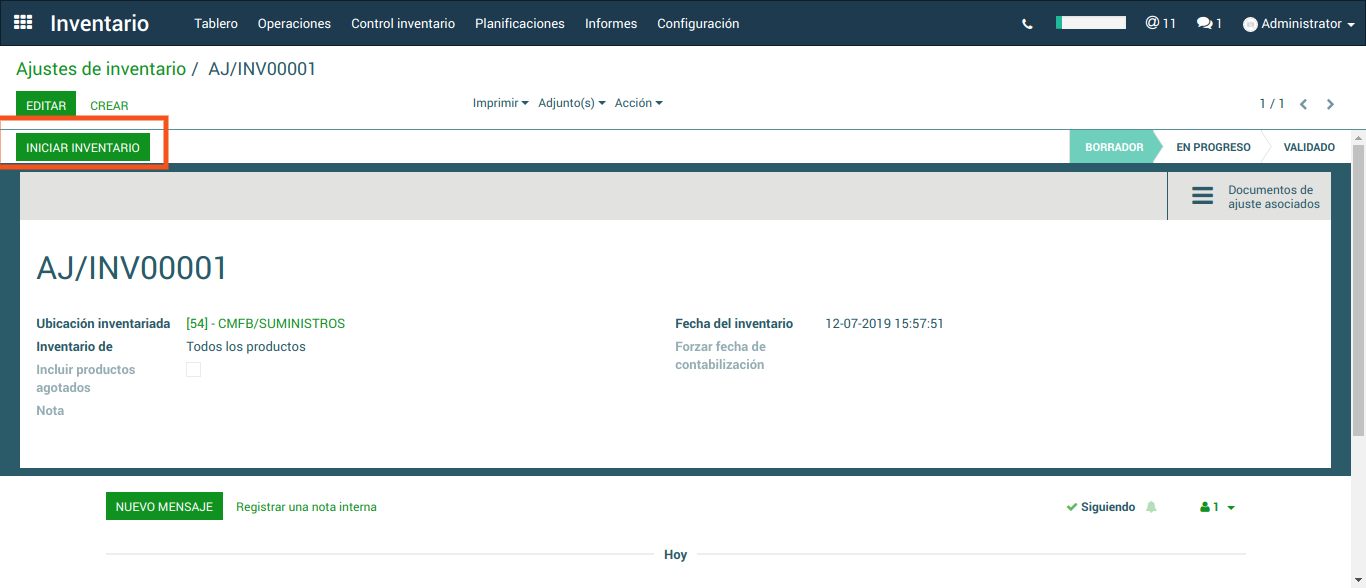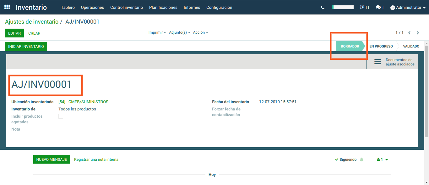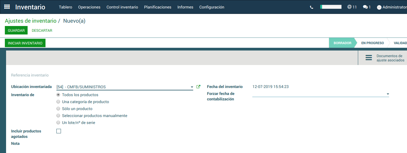 Ruta : Control Inventario > Ajuste de Inventario > Crear