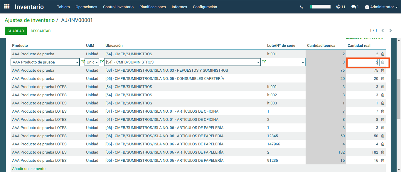 Por cada línea del ajuste de inventario se mostrarán los lotes del producto y las cantidades o stock que actualmente tiene. Por defecto el sistema muestra el Cantidad real el mismo valor de la cantidad teórica, pero se debe tener en cuenta que es la cantidad real el campo que se debe editar con relación a las cantidades que se encuentren al hacer el conteo físico en el inventario.