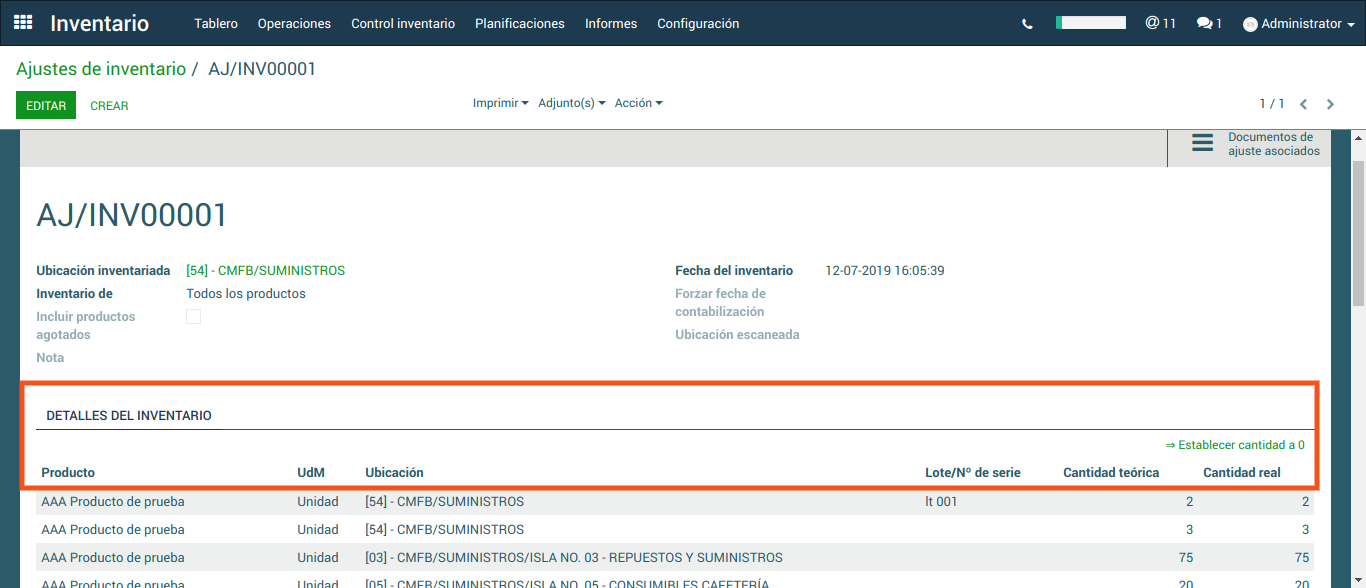 Luego de configurar la información del encabezado se procede a Iniciar el Inventario. El ajuste quedará en estado “En Progreso” y se mostrarán los productos que se van a inventariar con las columnas: Producto, Unidad de Medida, Ubicación, Lote, Cantidad Teórica, Cantidad Real.