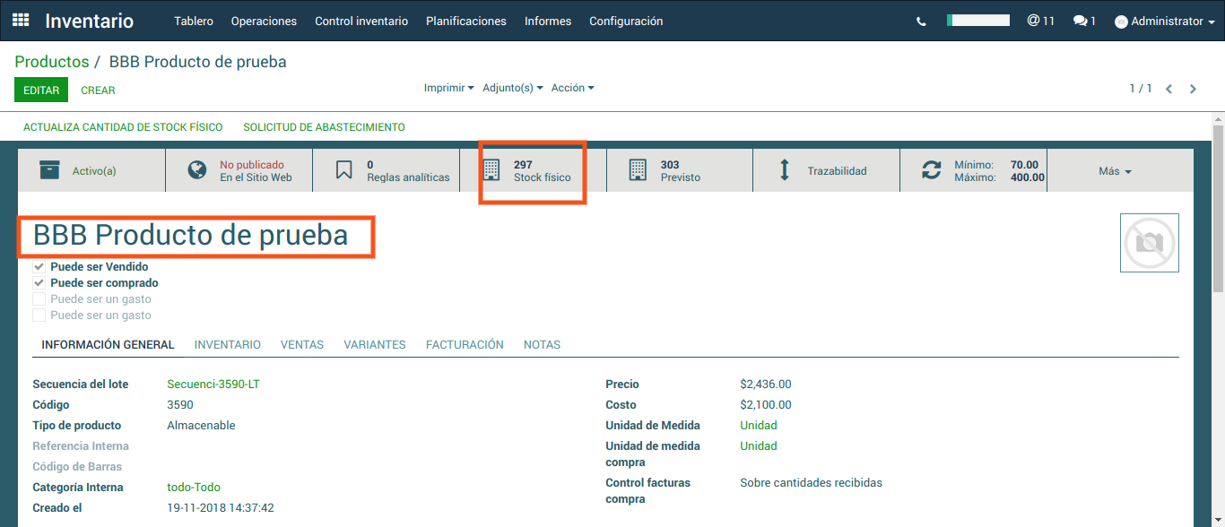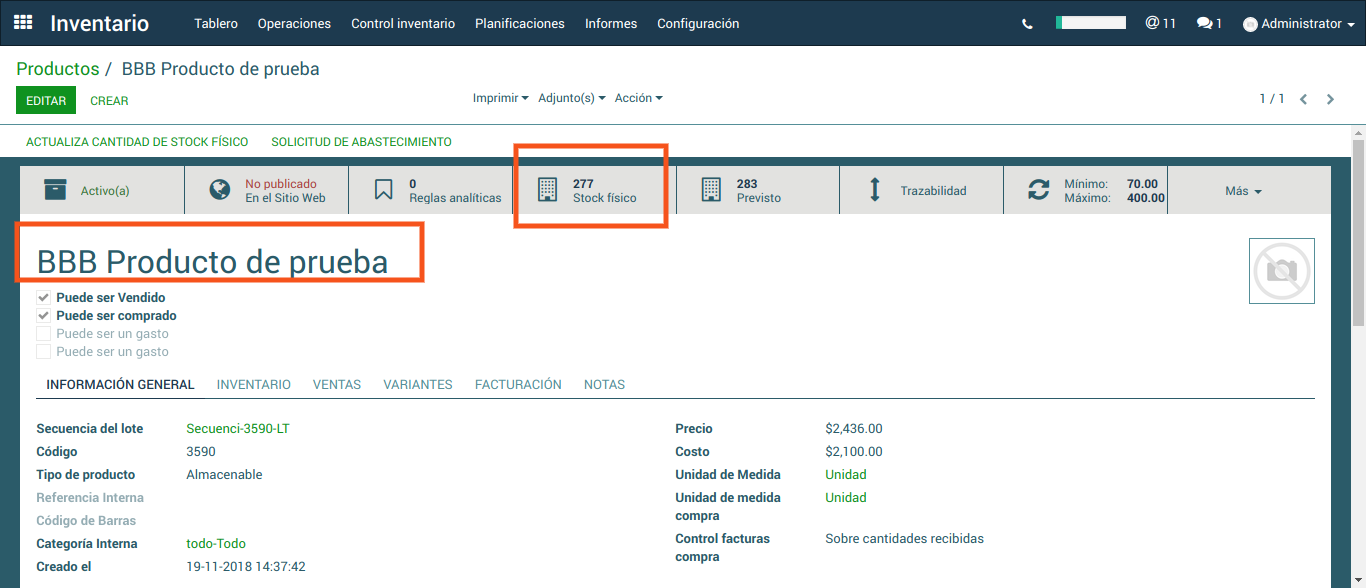 Se verifica el producto y se nota que efectivamente el sistema desconto la cantidad solicitada para desechar (20 unidades)