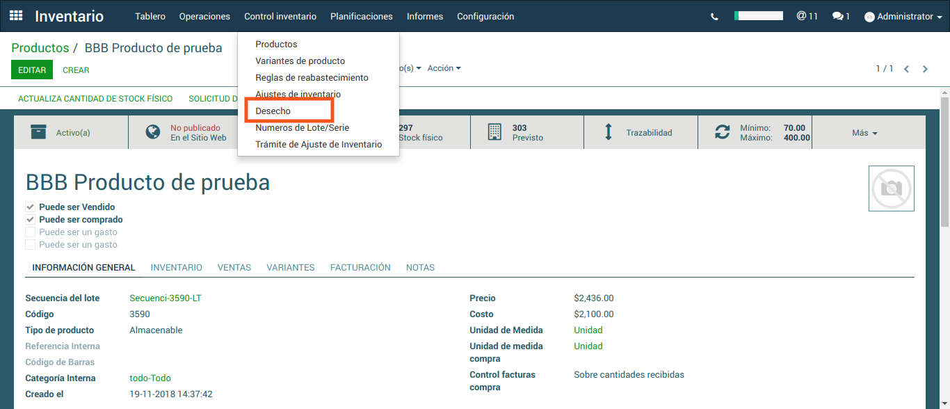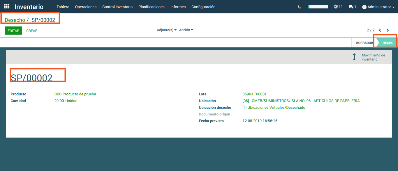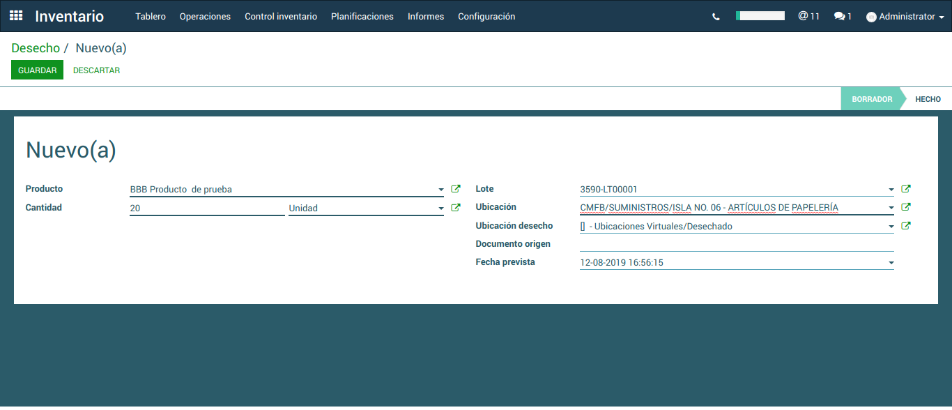 Ruta: Módulo Inventario > Control inventario > Desecho > Crear