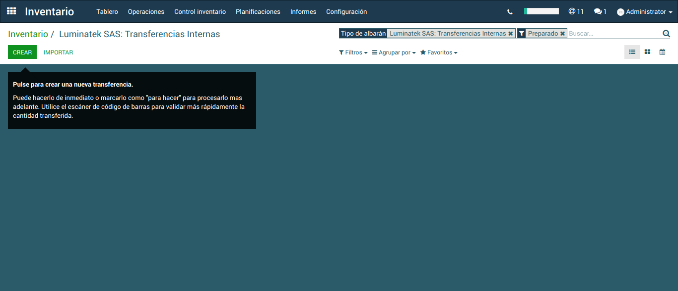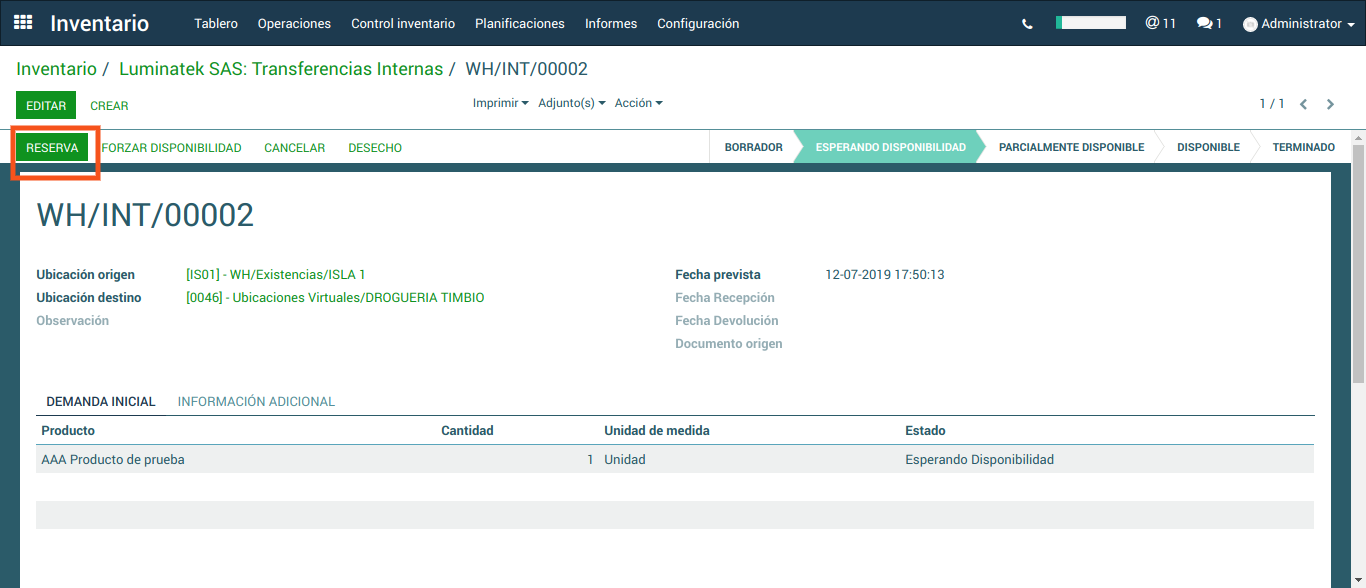 Una vez se realiza la opción “Reserva” y el sistema haya validado que existen cantidades suficientes para realizar el traslado, el sistema pasa la transferencia a un estado “DISPONIBLE”.