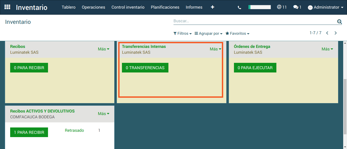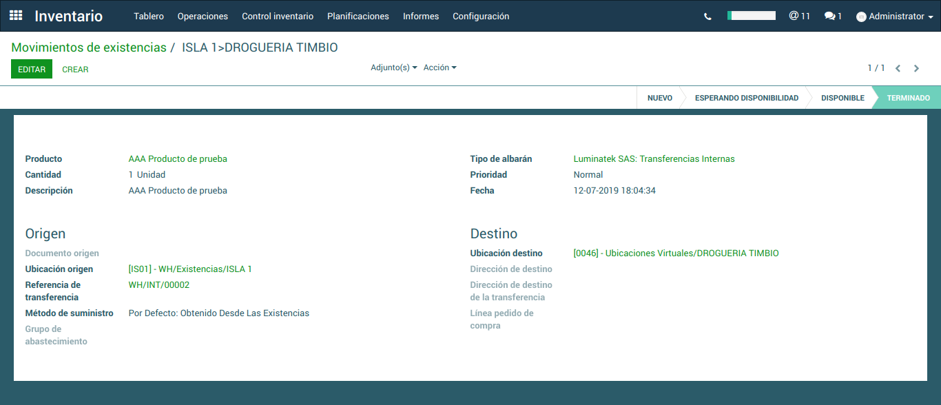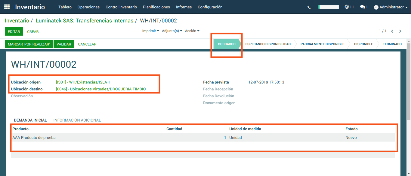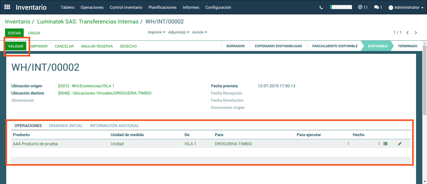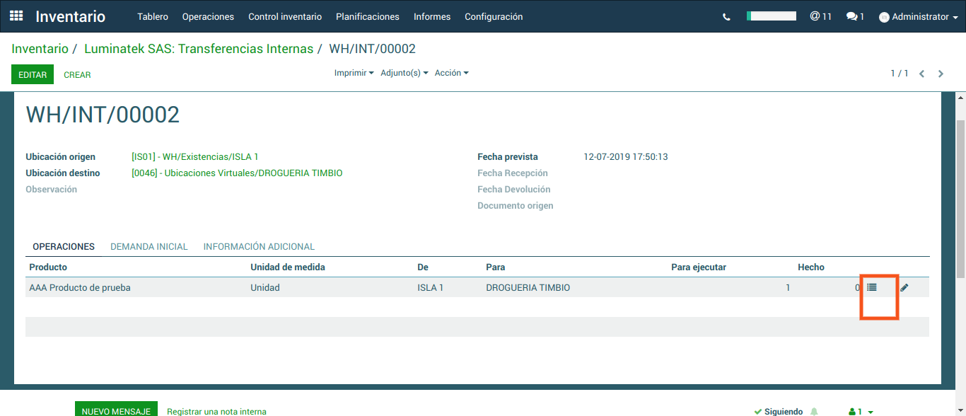 Después de validado la transferencia interna se debe verificar si efectivamente se movieron a la zona destino las cantidades que se trasladaron.