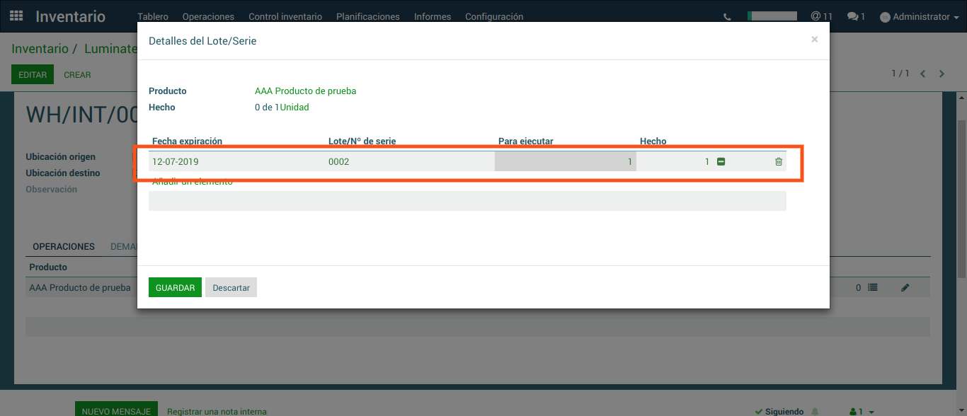Estando la transferencia en el estado “DISPONIBLE” se accede hasta la pestaña de “OPERACIONES” para verificar las cantidades y seleccionar el Lote de donde salen las cantidades.