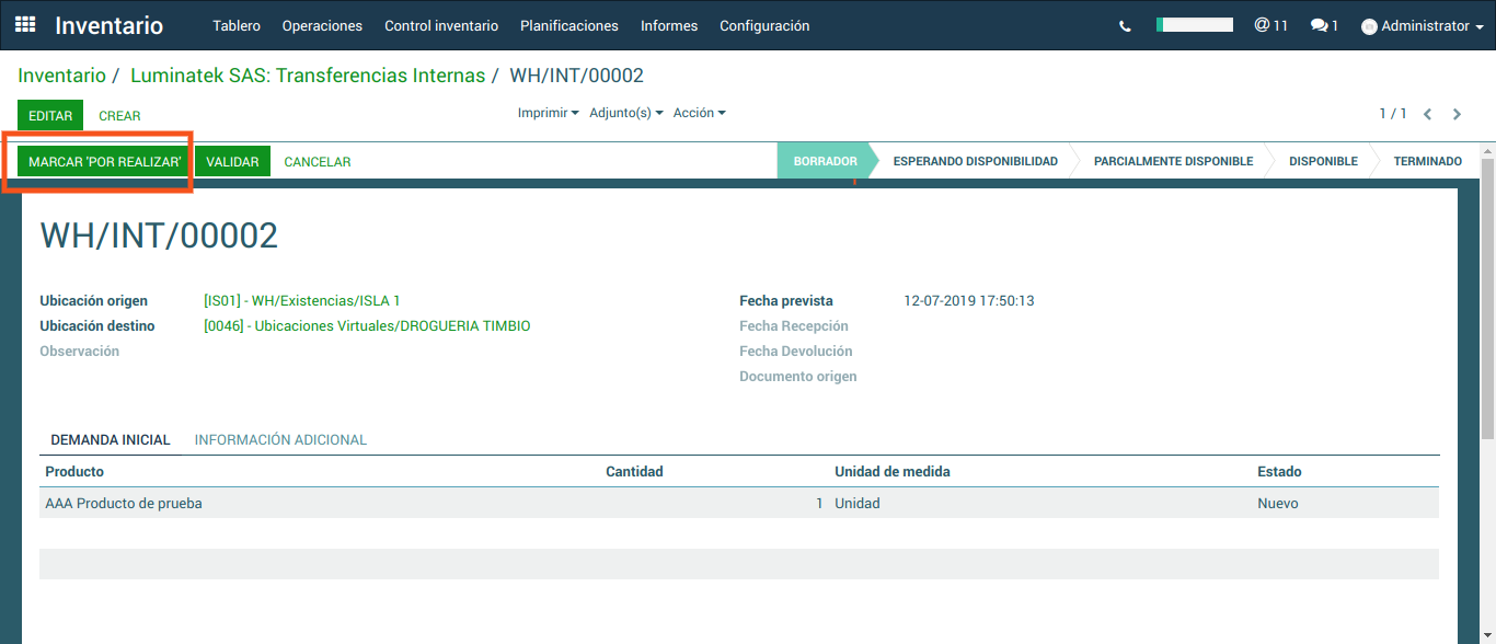 Una vez se guarde la información de la transferencia interna se selecciona la opción “MARCAR POR REALIZAR” dejando el documento en estado Borrador.