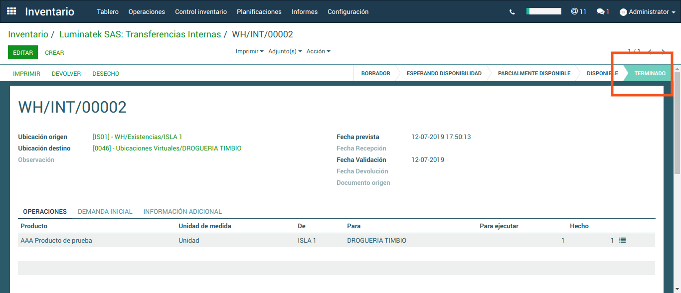 Una vez se seleccione el Lote correspondiente y se confirmen las cantidades en el traslado, se procede a “VALIDAR” la transferencia interna dejando el documento en un estado “TERMINADO”. La validación del documento de transferencia interna permite mover las cantidades de la zona Origen a la zona Destino seleccionada.