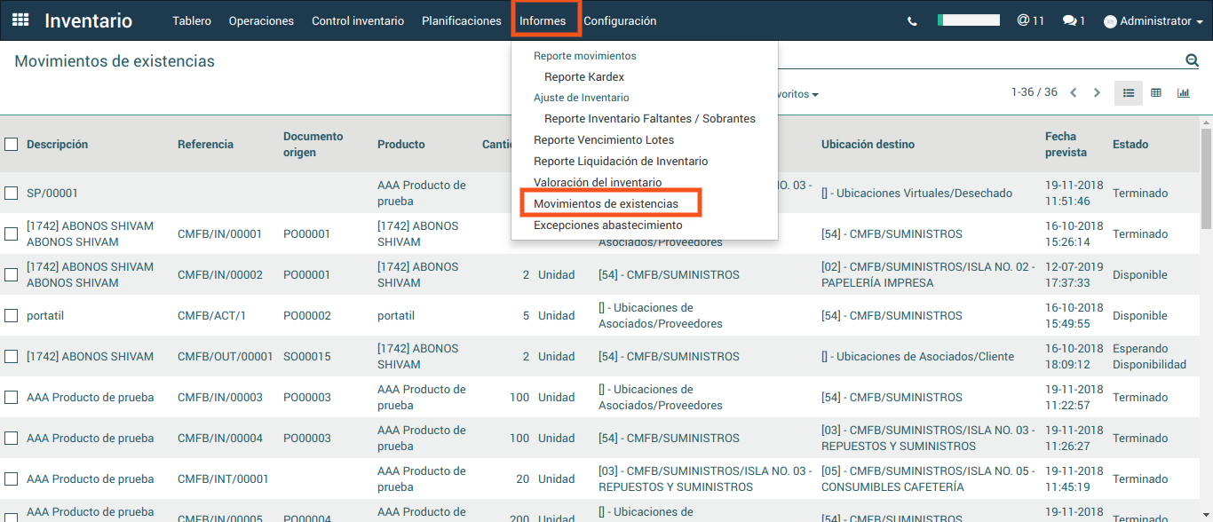 - Verificar las cantidades que se trasladaron a la localización de destino. Se ingresa por “INFORMES” y se selecciona “MOVIMIENTOS DE EXISTENCIAS”.