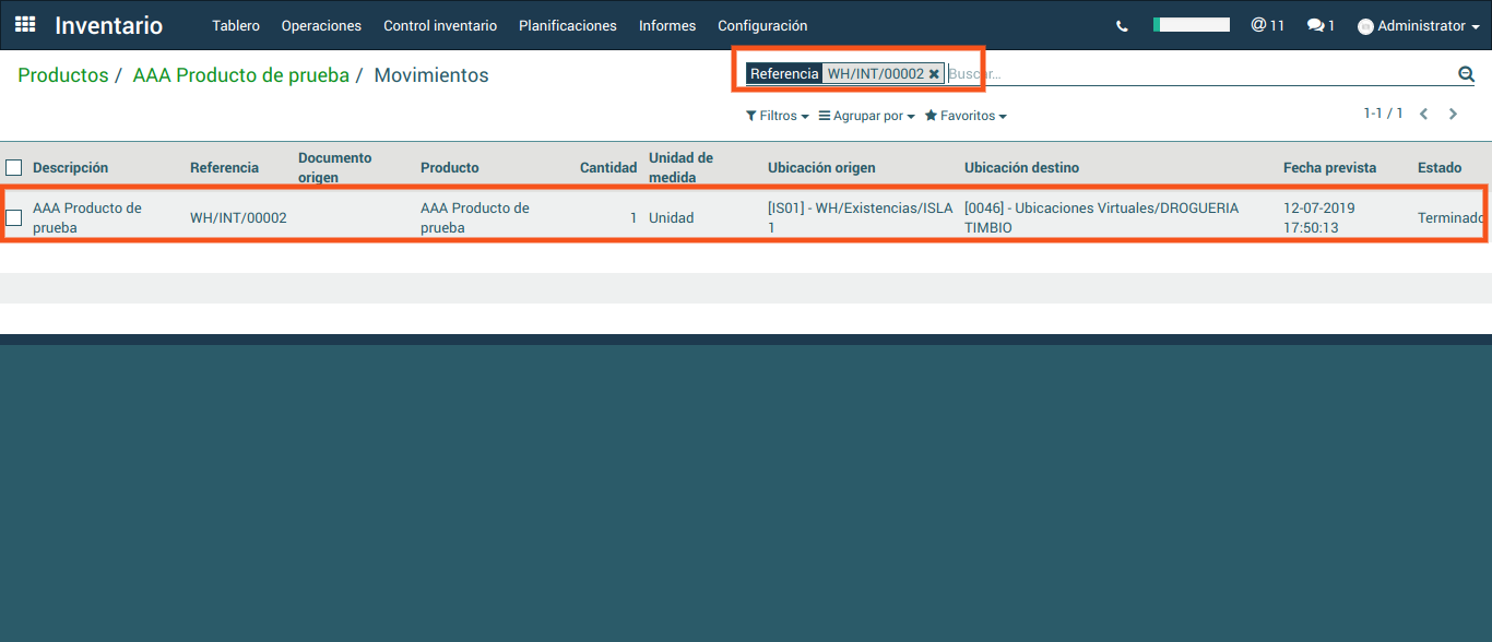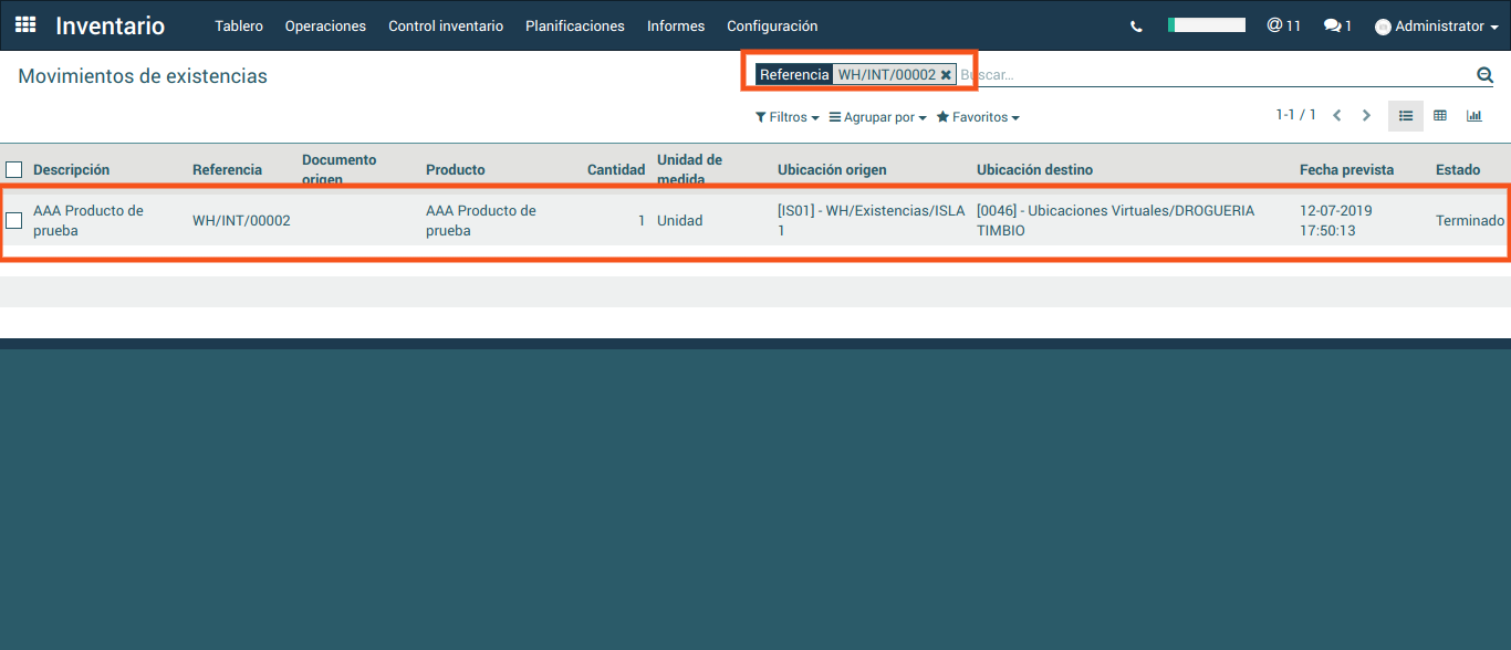 Se buscan los movimientos con el número de la referencia que para este caso es el consecutivo de la Transferencia Interna: “WH/INT/00002”. Por cada línea de la transferencia se genera un movimiento con las cantidades correspondientes.