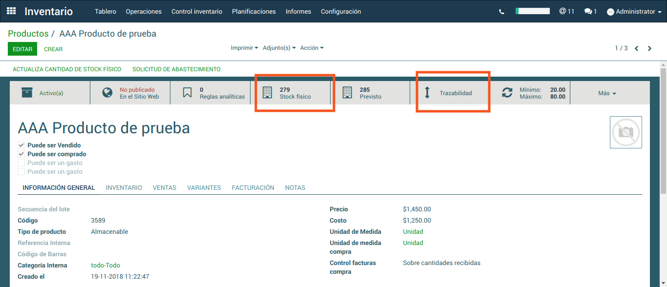 - Verificar es ingresando a la plantilla del producto de donde se enviaron las cantidades y ver el “STOCK FÍSICO” o la “TRAZABILIDAD” del mismo.
