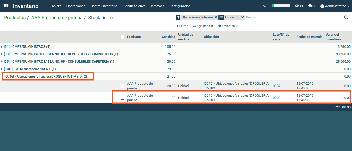 El “Stock Físico” del producto muestra el movimiento realizado de la Transferencia Interna en la ubicación respectiva.