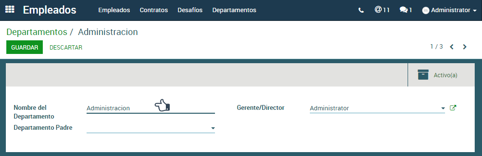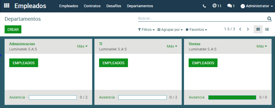 Para crear un departamento o área, ir a Empleados > Departamentos > Crear