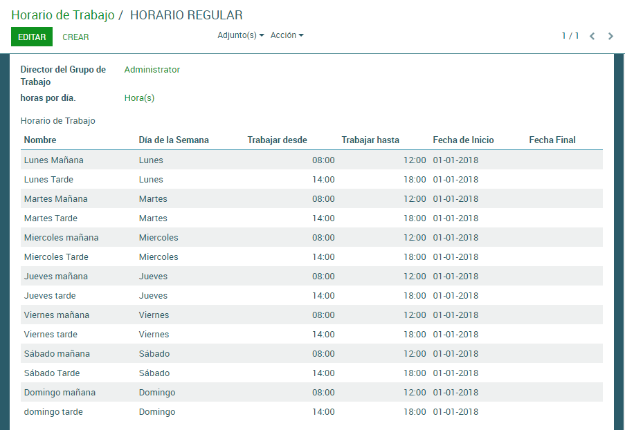Definir nombre al horario de trabajo, asignar los días de la semana, en jornada mañana y tarde.
