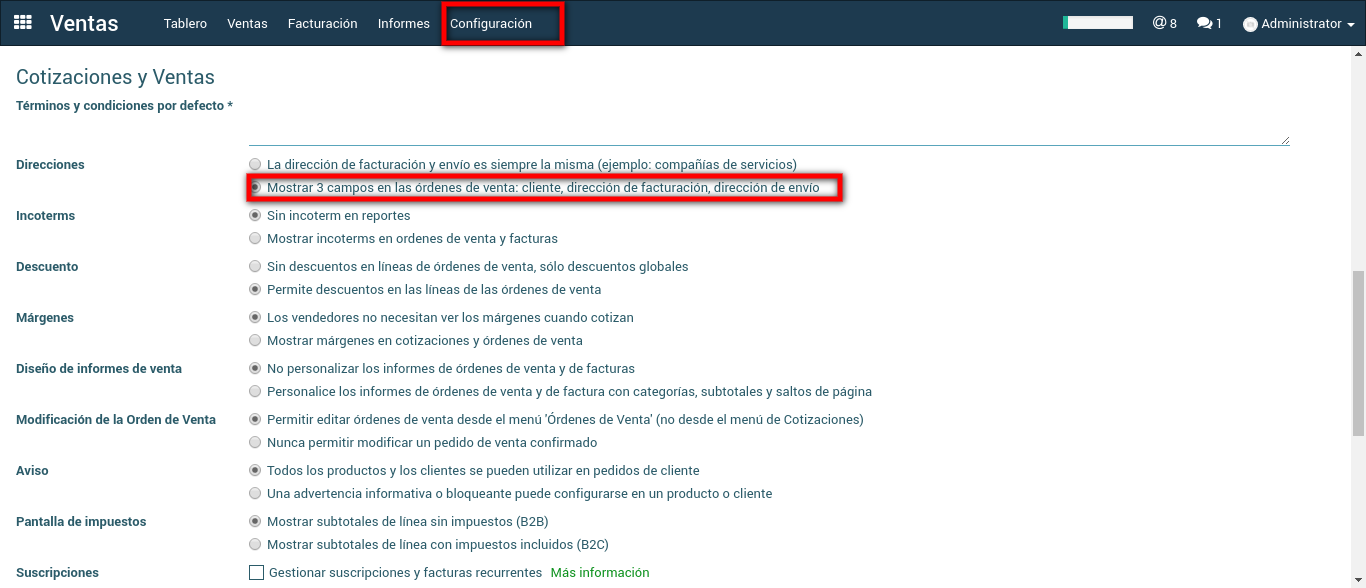 Bajo la opción cotizaciones y ventas, se activa la casilla para habilitar la configuración de direcciones múltiples.