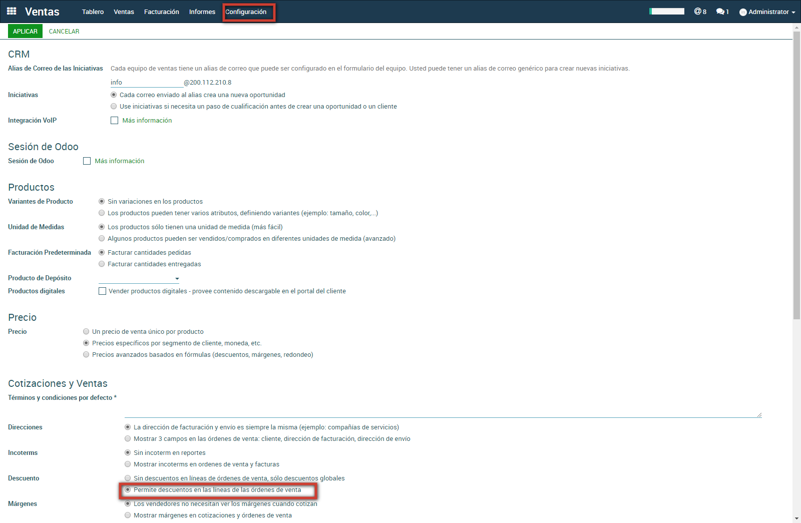 Bajo cotizaciones y ventas se marca la opción Permitir descuentos en las líneas de las órdenes de venta y luego se da click en Aplicar para guardar los cambios.