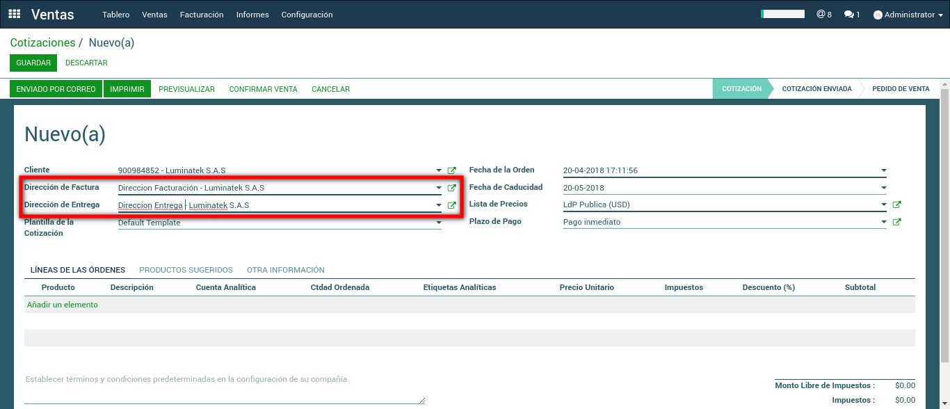 2. Cuando se cree cotizaciones y órdenes de ventas la opción para seleccionar una dirección de factura y una dirección de entrega ya se encuentra habilitada.