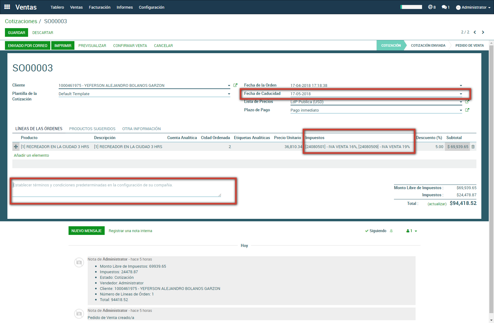 Se puede añadir la Fecha de caducidad, Impuestos, Términos y Condiciones directamente en la cotización. Finalmente se deben guardar los cambios haciendo click en el botón Guardar.