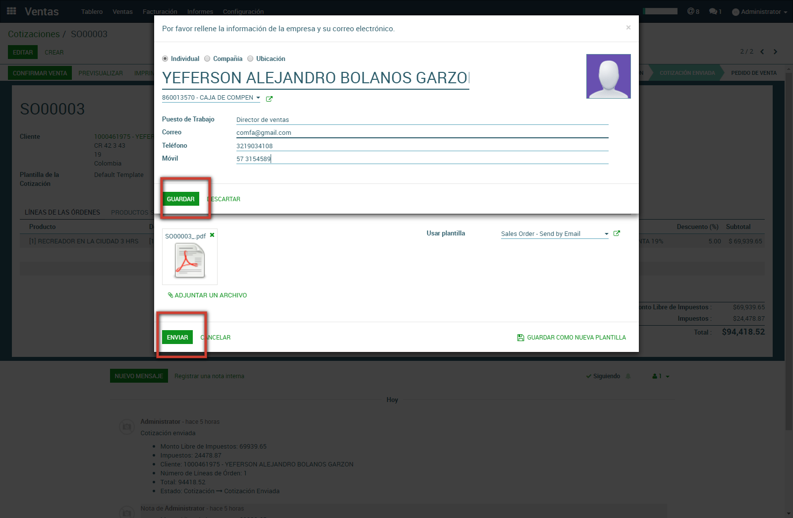 Para enviar la cotización automáticamente al cliente se da clic en el botón Enviado por correo, se puede ajustar el cuerpo del correo electrónico antes de enviarlo e incluso guardarlo como una plantilla para utilizarlo a futuro. Clic en Guardar y luego en Enviar.