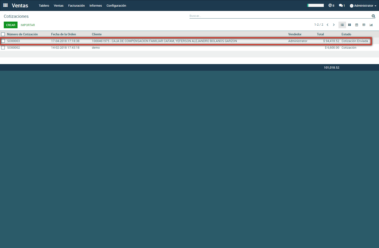 Si se vuelve a la pantalla de las cotizaciones, la nueva cotización se visualiza en estado Cotización enviada.