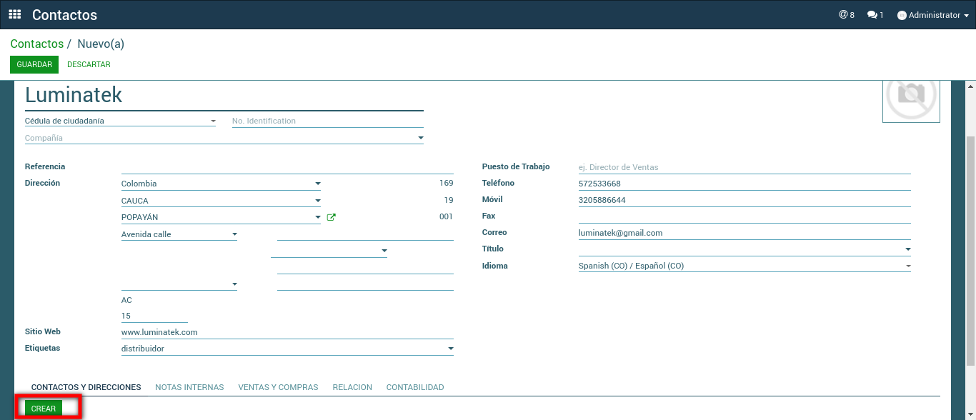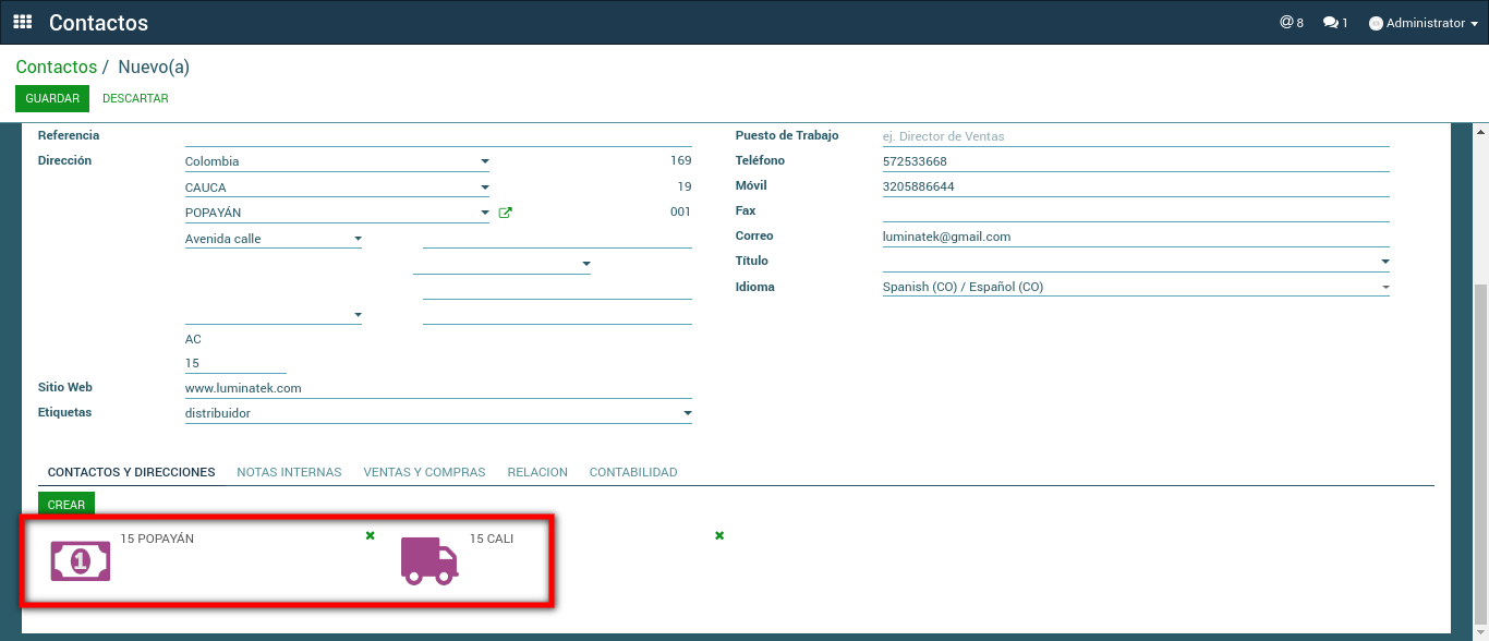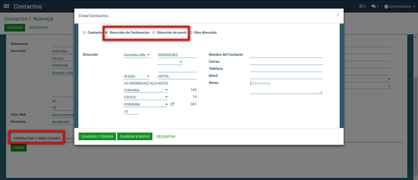 1. Se debe establecer las direcciones de contacto en el módulo Contactos.