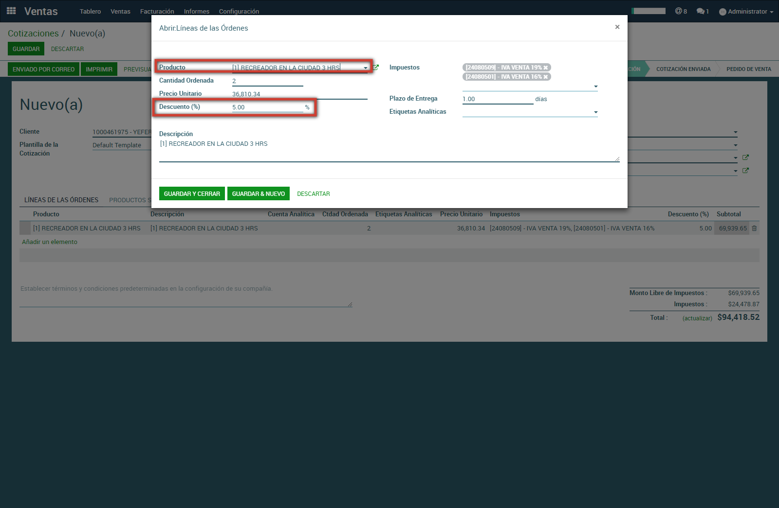 Antes de crear una cotización se de debe permitir descuentos en las líneas de las cotizaciones y órdenes de venta.