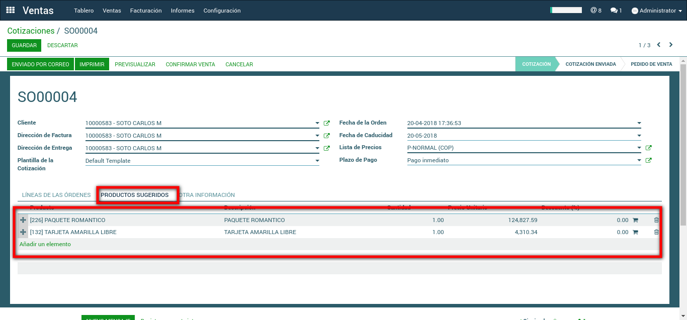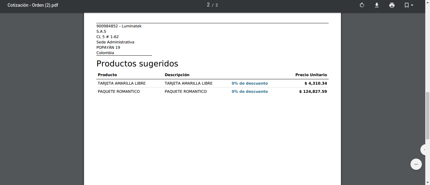 Si se imprime la cotización, se observa que en la primera hoja se encuentra el producto principal y en la segunda hoja los productos que se añadieron como sugeridos.