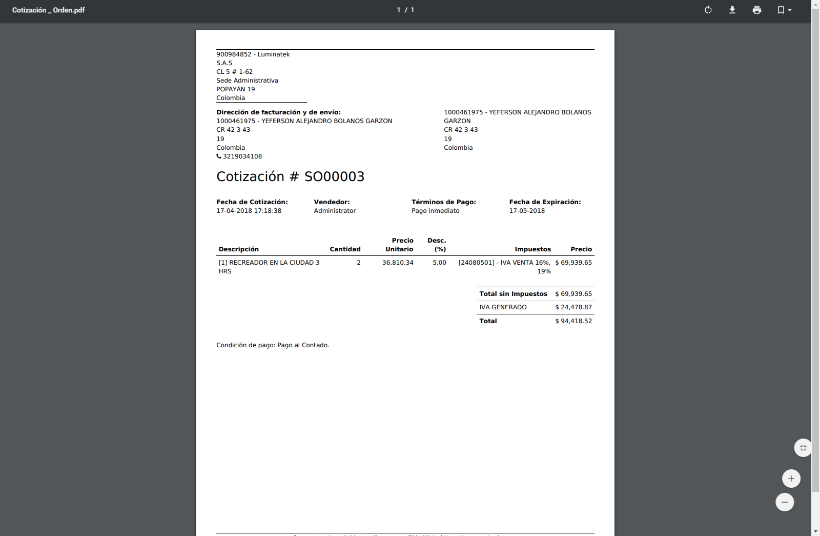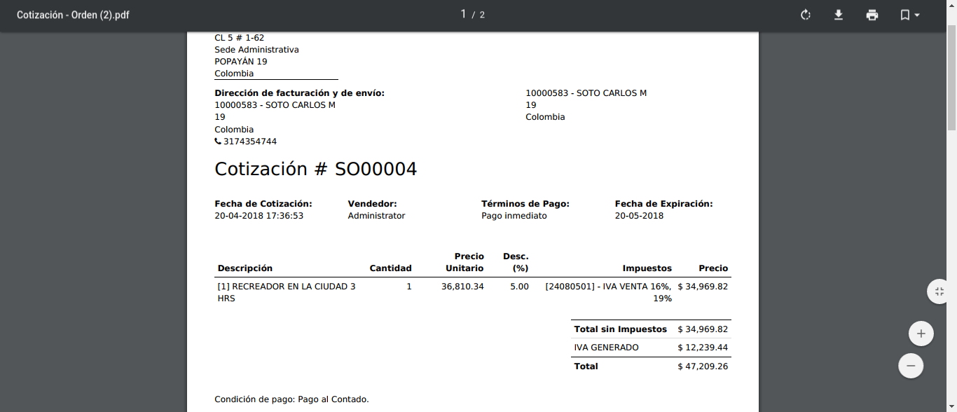 Si se quiere ver la cotización antes de enviarla se da clic en el botón Imprimir y se genera una versión en PDF con todos los detalles de la cotización.